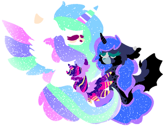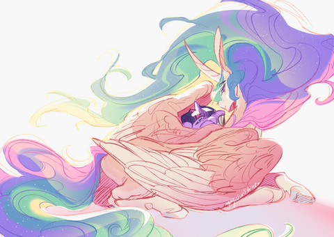 Celestia was gazing at her, at her belly moving with every breath she took, at that mane she only saw her in that state so many centuries ago with no ethereal effect, but as simple as her little ponies for the lack of magic in her. This lack who gave her that fragile state that she couldn't bear to watch without tearing a bit. She was so smaller and weaker, but she was there. Perhaps it was her lack of sleep, but she kept wondering if she was sleeping and this was just a cruel dream, among the numerous other she got over the centuries, agonizing her hopes of her return. In that case, she was nuzzling her lovingly and the simple touch making Luna slowly shift brought tears to her eyes because for centuries, she longed for that soft, loving sensation over her muzzle. That night, Celestia was protecting with her immortality the most precious living being to her eyes that she lost over a millenia and Luna, sleeping peacefully probably for the very first time since her banishment, was smiling.
