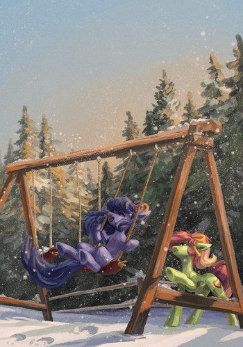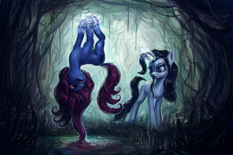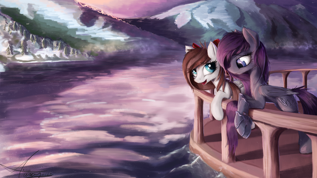 Regardless, both scenes are gorgeous (and from both angles), and they blend together perfectly as part of one complete world. Beautiful job on all three ponies (one of each type, I see), all pretty and lovely as ever, and the two "below" seem very sweet and kind as they chatter away; there's no hint that they want to exclude the lonely mare, but it's just something we introverts do to ourselves sometimes. The space pony's sadness shows beautifully too, and it's easy to wish we could just hug her until her world is turned right again. Thanks for sharing this moving scene.