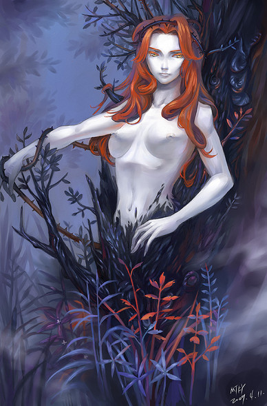 Her hair flows magnificently And I like how her lower half is covered by what I would imagine is some very flexible plant life