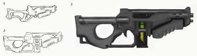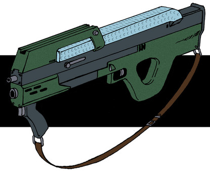 A hurried redraw of a gun I designed back in March, a caseless, electronic-action, selective-fire battle rifle with over-and-under pump-action grenade launcher. It features a bullpup configuration, a digital ammo counter on the right side and a large-capacity drum mag. It is the standard service rifle for the United Systems Government Marine Corps (USGMC,) supplementing heavier, more esoteric weapons such as the M6 phased plasma gun and the M77 Gauss rifle, which also come standard in the USG marines' arsenal.When I drew it I was inspired by three existing guns: The M41A pulse rifle from Aliens, the new BR85 battle rifle that will be appearing in Halo 4, and the real-world Tavor TAR-21. I will finish this hopefully soon enough, since it's an awesome gun.