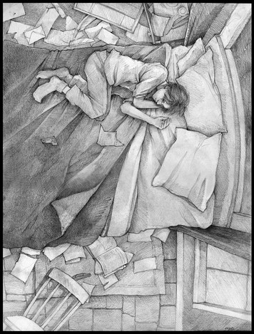 Art! Finally. Here's Hermione doing Harry and Ron's homework. At least Harry has the decency to try and stay up. I love that he's kicking over Ron's foot stool. That was complete drawing fluke. Or was it..?Related content
