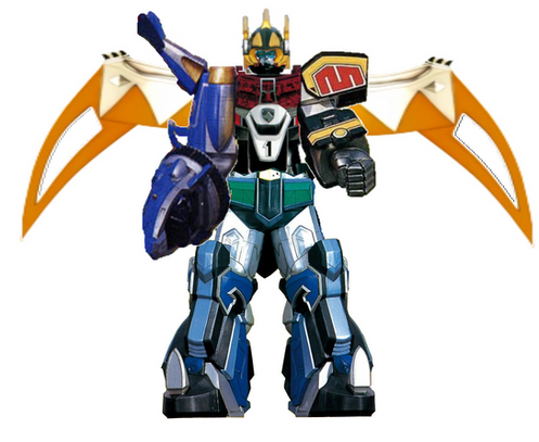 The Royal Knight Ranger, with her Monarch Skyship Zord in both Butterfly and Megazord modes and her weapon, the Monarch RingRelated content