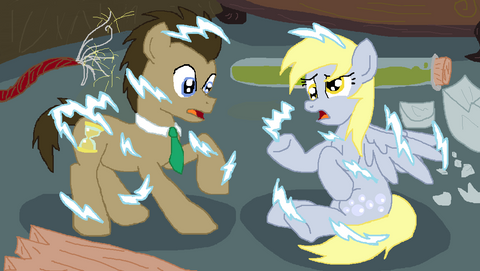 It's Derpy and Doctor Whooves having a good fun time with science. Took a day or two putting them together in Photoshop.Reference: Β First attempt: