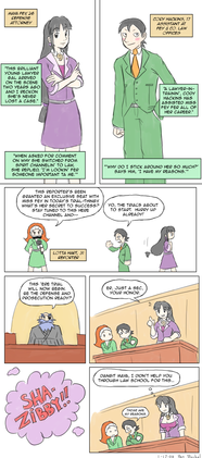 Either cuddle or freeze to death!This was a commission piece requested by Quizer on the Court Records forums, based on his Phoenix Wright fanfiction "Ultra Course." [link]