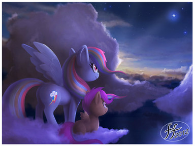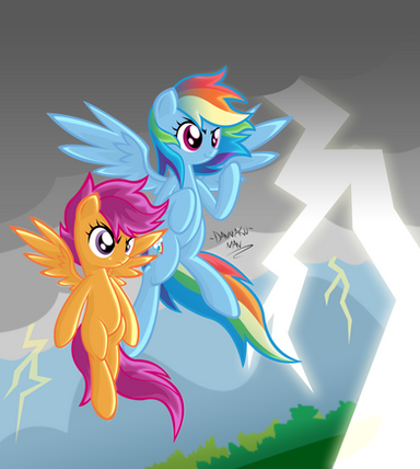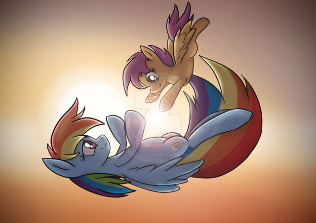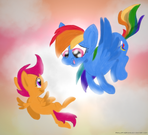 This is a really heartwarming picture to me. Β Dashie taking the time to try to help Scootaloo learn to fly is a wonderful idea. Β