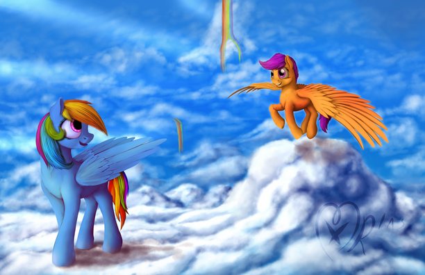 Originally was meant to be a badass Rainbow Dash, but then I thought, "why not have Scoots being awesome."I like how this turned out, but I can think of a few things I messed up. Still, had a lot of fun doing this.