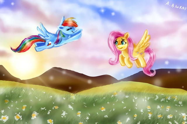 #fluttershy #green #mountains #nature #naturewalk #rainbowdash #sunrise #valley #flutterdash