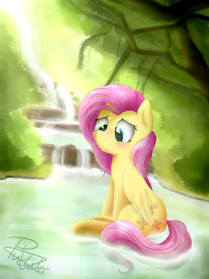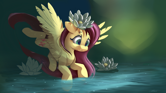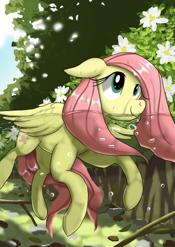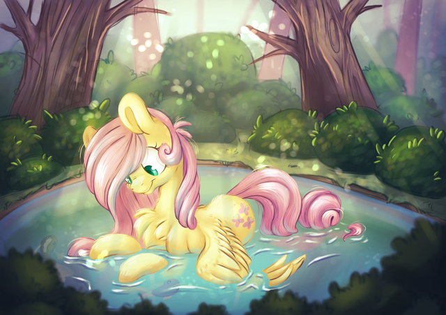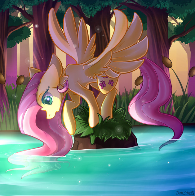 #mlp #skimming #cute #everfree #fluttershy #forest #hovering #lightbeams #pegasus #pond #reflection #touching #watercolor #mylittleponyfriendshipismagic