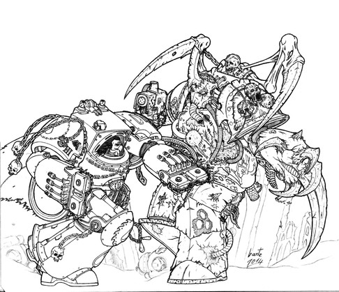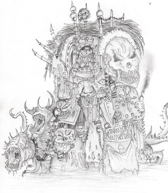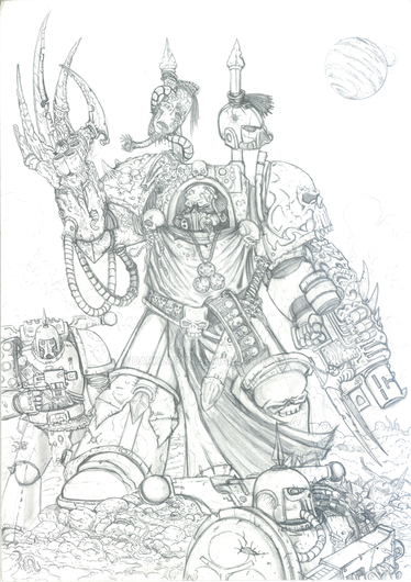 Great stuff. His left arm seems a little short to me, and I'm not certain that the exposed area above his left knee quite works, but the detail is gorgeous, especially on the possessed, and I love the transitional parts where there are still Imperial iconographs visible on the mutating armour.