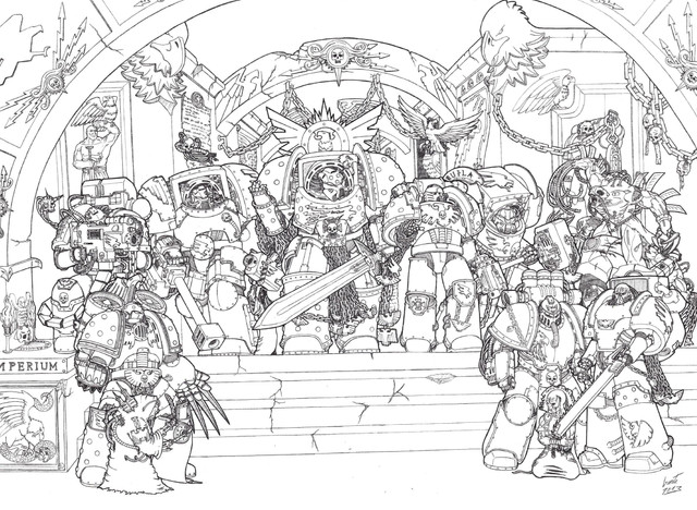 The detail work you put into the armor always impresses me. In this I really like the linking ring and Chaos star patterns. As well as the horns and helmet damage on the marine to the right.