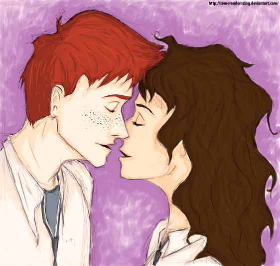 They're very cute together! I like how you gave them a different look than the actors from the movies. It's also really well drawn - the hair, Ron's freckles and the realistic clothing! Great job!