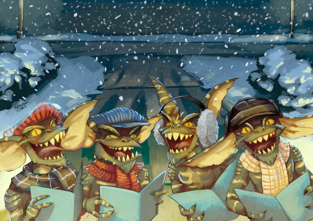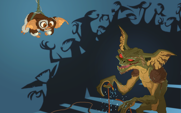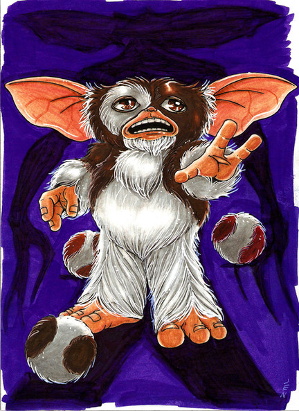 I love this pic! Very nice how the mean gremlins are in a large cluster with long moving arms indicating quick movement and frenzy toward poor Gizmo.