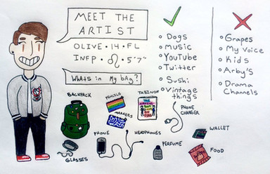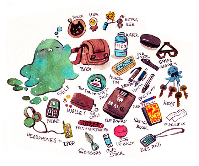 Whats in my bag: Sketchbook, colored pencils, sharpener, Tape, Lipbalm, Tweezers, fish with money, keychain of saucery, tiny waterbottle, cellphone, pocketknife.