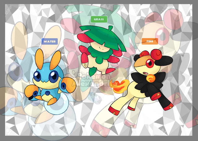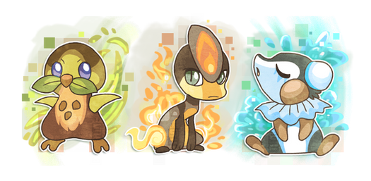 These are super super amazing. They should exist lol. I adore the grass one, mainly case it looks epic and I love owls, but I always pick the water starter lol. But they are all good. I found it interesting how you gave the grass one blue eyes, the fire one green eyes, and the water one red eyes --> nice touch