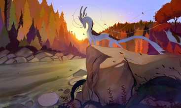 Interesting. I like the colors and shading a lot, and the grass is really great. Of course, why would I focus on the grass? It gets annoying when people compliment your drawing....by saying 'oh the eyes are nice C;'. I mean, what is the point in that? I sit there like, don't you like the rest of it? So, about the rest of the drawing, the detail is remarkable! Really truly amazing. The bark on the trees could be slightly more defined but I couldn't do any better. The lighting seems almost perfect, and I love the perspective! It's brilliant. You really achieved something great with this piece. It's very calming, and I love her expression. Somehow, I can see longing, as if she longs to return or to go somewhere. Or perhaps she's just looking into the distance. Either way, I adore the emotion on her face. The leaves...what can I say? They're pretty much perfect, but for the floating ones on the lake, maybe there could be a couple more ripples. I should point out more positive elements. The color palette you used is dull, but that's good! I love the purple shade, along with how the blue reflects the gold. I just noticed, derp, that Host's pelt matches the trees! Everything is in harmony in this picture. And the title you chose? Short and simple, 'Fall'. I wouldn't put it better.