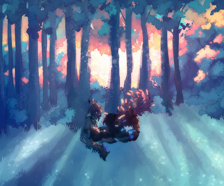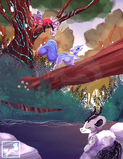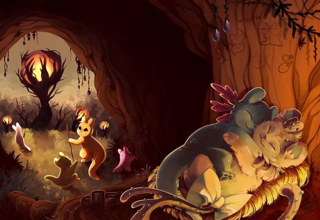 Holy, epic-ally fantastic! Atom, Philia, Kupa, Snuffen, and Stewart are stunning and This Forrest Landscape looks incredible! The expressions, poses, designs, interactions, plant life, magic, skull, eyes, atmosphere, basket, composition, concept,uniqueness, lighting, colors, style, and other details are also wonderful! Magnificent work!