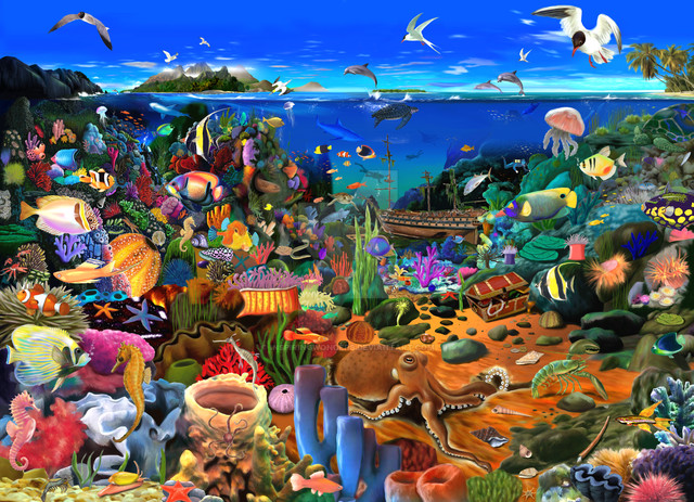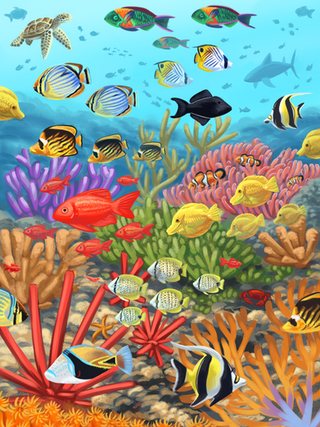Even though I have a fobia for fishes, I find this piece breathtaking. Everything looks in harmony together, it's really lifelike. The fish on the left (black/white/yellow) looks AMAZING, seriously, that texture on him is a great detail. The turle looks so sweet~ Oh! Even though you made up those fishes around the turtle, they don't look out of place at all. If you didn't tell me I would've never noticed. Great job!