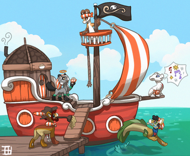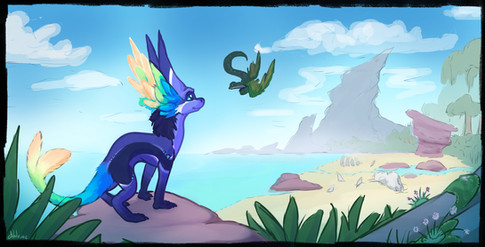 I love the detail you put into this, and you only used one layer! The color of the sea is beautiful, and the way you did the fox's/dog's fur is simply amazing. The gray character is simple, yet interesting and adds something... Mysterious to this painting. The way you draw amazes me! I absolutely love your style!