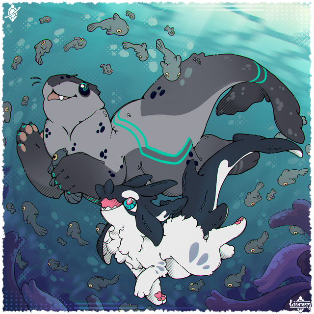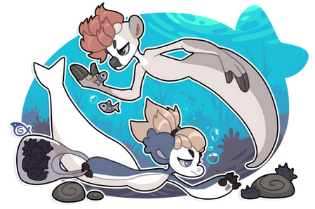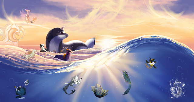 ugh this is beautiful. Β i wondered what that guy on the left was doing with his tail in the water o; i thought he better get it out of there before those fish bite it, and thought of shellder and slowpoke. Β