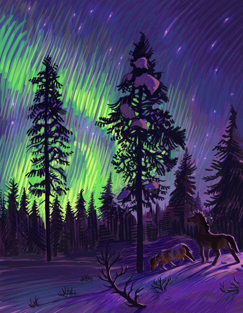 I love the whimsical representation of the Aurora. I would say that the rough edge on the left-hand-side is perhaps a little too wide (makes it look a tad unfinished and throws the composition off slightly) but the other edges look great left as they are. The colour scheme is perfect.