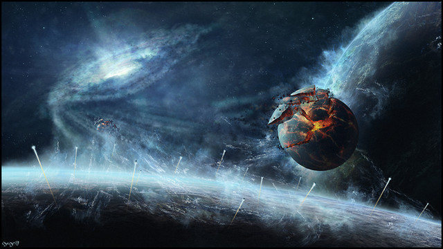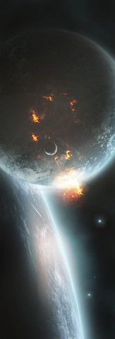 Wow, this is scary and fantastic. I love how the explosions look like they're displacing the atmosphere, and the way the planet/moon is cracking as it breaks apart.