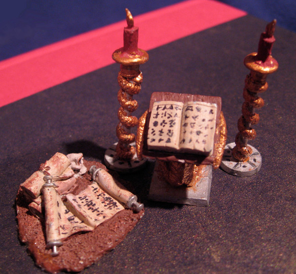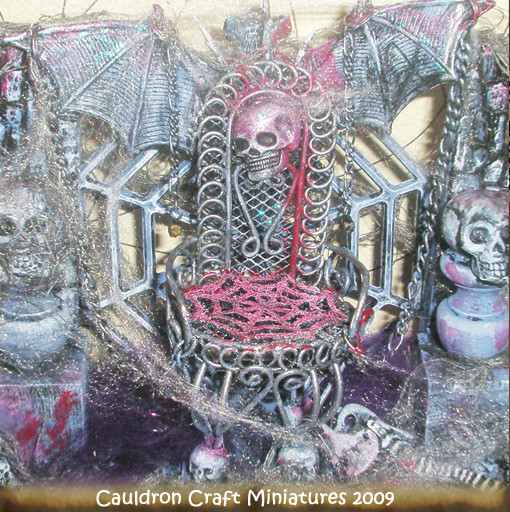 This is an altered 1" scale miniature set. I used Skeleton warriors and spawn bits, a lot of epoxy putty, vintage jewelry, sculpy, and vintage fabrics. Painted in acrylic and inks. Personal collection.Related content