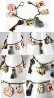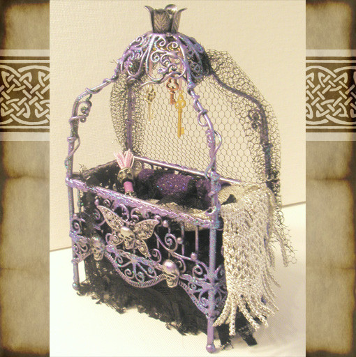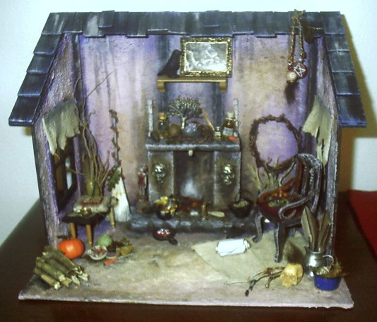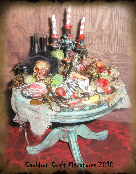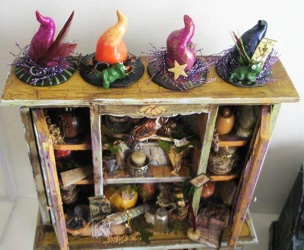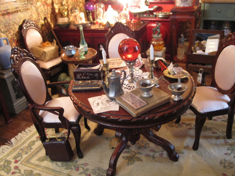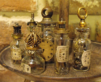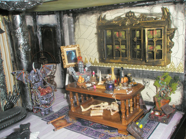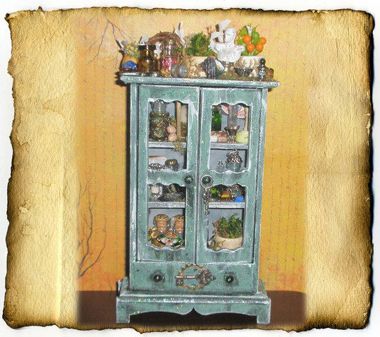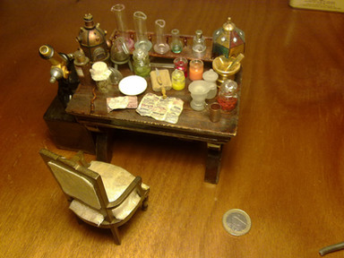 Welcome to Cauldron Craft! This is my miniature Steampunk Percolating Potion Table. A magical OOAK piece that is in 1:12 scale, standing 6 ¼” tall x 3 ¾” wide. The wood circular table has a central mechanical tower with a metal umbrella and it is overflowing with secret sorcery ingredients. An unusual addition to your witch’s lair or wizard’s laboratory!Various charms and gears hang on chains from the umbrella and each of the four table legs boasts magical items: lavender herbs, a ring of skeleton keys, a magic golden spoon, and a little gold wire wrapped broom. Gears, handles, gargoyles, and buttons are seen on the center tower. The table top has rivets all the way around. The table has been stained black and distressed with sage, bronze, and gunmetal.