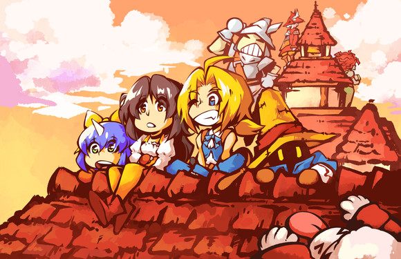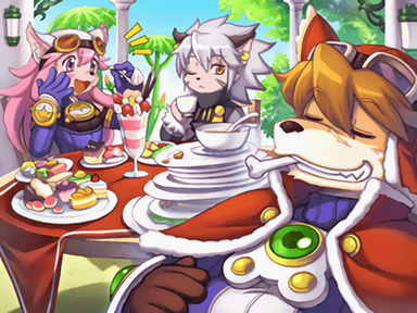One of photographs pictures from the great game Solatorobo.Starring Red, Elh and Chocolat, eating on a restaurant.