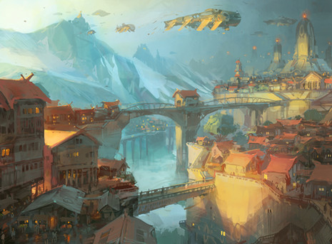 #city #cityscape #clouds #colors #colourful #conceptart #digitalart #digitalpainting #skyclouds #spaceship #town #grivetart #grivet #bastiengrivet