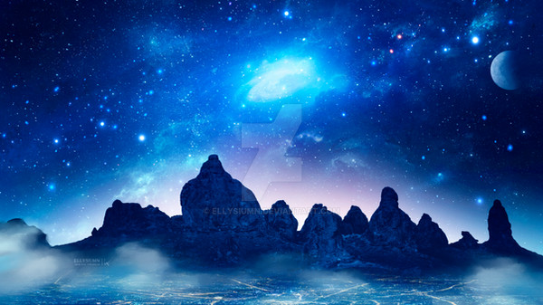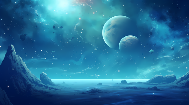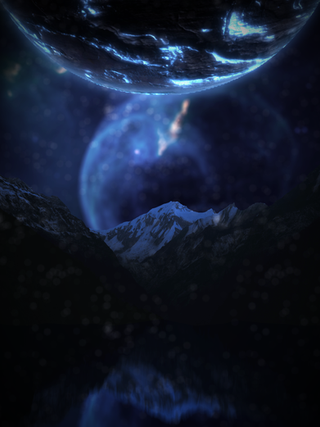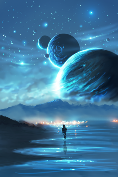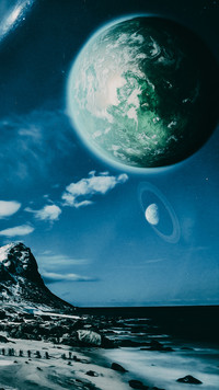 Awesome scene. Seems like the utimate beach. Are those moons surrounding that planet. Or is it a planet with a moon that has a moon?