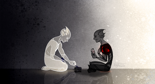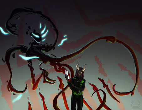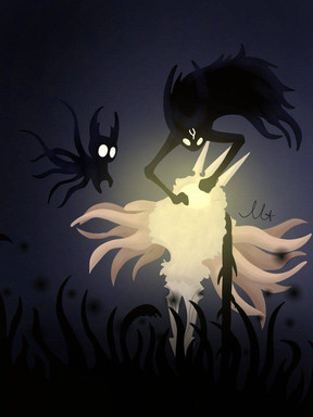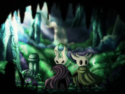 This is a collaborative piece between Ausp-ice and myself! Featuring my character Linast and their Hollow Knight OC, Elk , in a scene from a roleplay we're doing.Auspice did the initial sketch/composition, then I did the lines, flats, and background, and then Auspice did some gorgeous shading/lighting/effects. I had a lot of fun working with them, and am really happy with how the piece turned out!
