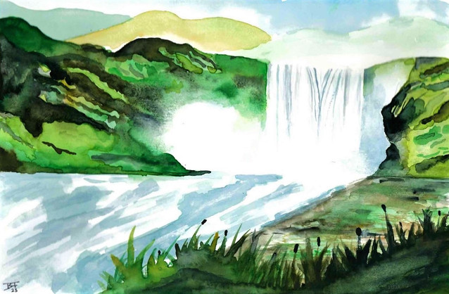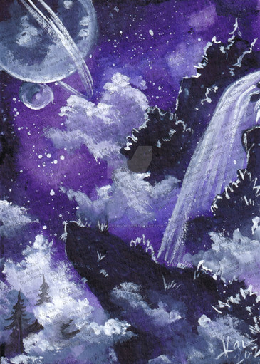 #blue #forest #inkpainting #lake #landscape #magenta #mist #mountains #nature #outdoors #pinetrees #pink #purple #scenery #traditionalart #watercolor #waterfall