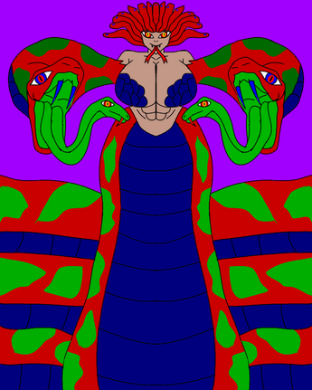 Snake-like member of the Bad Girls with Booty(BGWB), Asp. She is agile and moves very fast for her built. She can elongate her arms that can encircle and squeeze anything with incredible force. She can also make her hands into snake-like appendages that can strike with lightening speed. When they do they inject paralysing venom in the foe which slows the opponent down until they can't move putting them at her mercy. Asp can release snakelike appendages from her arms that can also ensnare her opponents binding them with crushing force as well as exploding the appendages to cause greater damage. When ensnared the more the prey struggles, the stronger the wrappings become. She can also control the minds of her prey for a short time casting illusions and making them her thalls. She's able to blend in with her surroundings and is resistant to other venoms and poisons. She's a viscous fighter.Asp is a member of the BGWB and the OC of