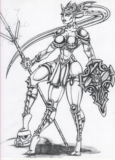 This is a pic of a female klingon warrior that I fleshed out from a drawing done by James Butler from my job. She's holding a klingon bat'leth staff(a weapon he created for the lady).Design by James Butler who gave me permission to post his character on my gallery in my style. Thanks James.
