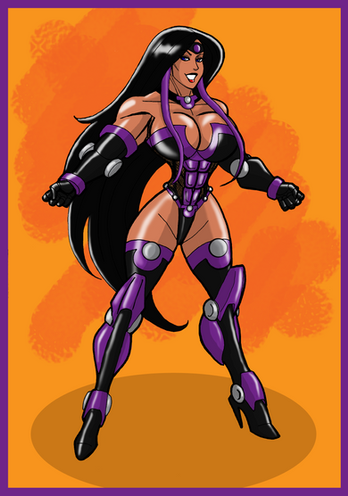 Her arm bands allow her to create any type of hand weapon she's has come acrossed and that was saved into the bands. They provide a forward shield for protection and allow her to fly. She is a viscious fighter and has +100 strength.