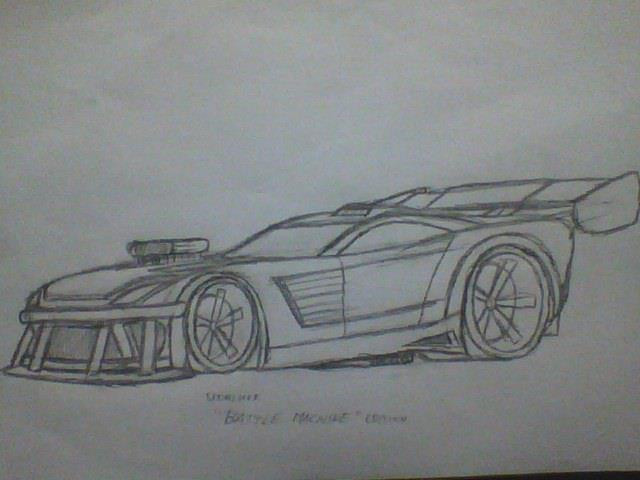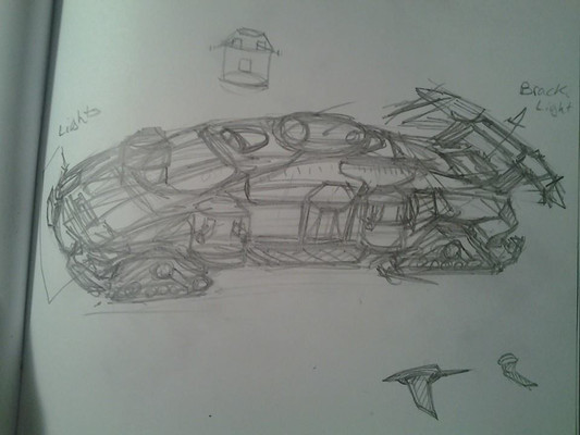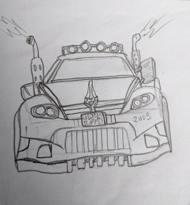 One of my more crazier car designs,this was a car based after my OC Tatsuya's story along with another OC of mine.This car you see here was more or less an escape or surviving racing vehicle.You see..Tatsuya and this other OC to be named lived on another planet,which was bound for the destruction as an accident sending out a virus or danger of some sort that devours anything it comes across,the more is agitated,the more it grows and eats anything in its path.Since most of the home world of Tatsuya and the other OC had left the planet for safety,only a few were left back on the planet where this thing was in its final stages of development of devouring most of the planet.After the few remaining people found a single remaining two seater shuttle was found they made a tournament and who ever one the tournament would get the ship and escape leaving the others to die.The people who raced at the tournament used disused machinery and gutted parts out of them to make supercharged racing machines out of normal cars.This was the car Tatsuya and the other OC drove in for the whole tournament,they were both a team of two in one car.After going through all the races going from more and more dangerous because of this virus devouring the place more and more,they won,however the shuttle was eaten and they used the last resort of using the afterburner of their car to launch of a ramp onto a fallen building,rocketing on the side of it and launching themselves into space where they escape.