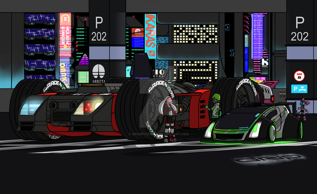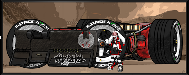 At the moment, there are two cars in this picture. Car #1 upfront is named the Renesis NRX-33, a 3 rotary tri-turbo racing machine and Car #2 behind it is named the Manji 920-S, a modern day hot rod utilizing the wreckage of a sports car. I'll put a much more detailed description of the cars and drivers in their respective pictures later down the road.