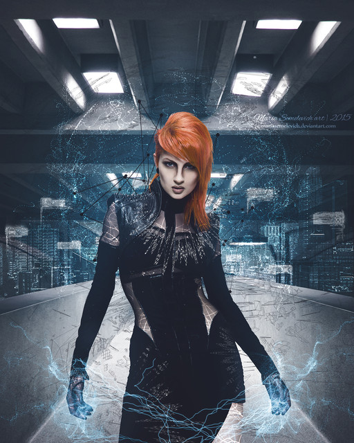 This piece has a consistent color theme to it and elements that make it seem "cyber". For example, the lightning strikes gives it the electricity vibe and the goggles the woman is wearing makes her seem like a techie of some kind. All in all, a pretty good piece. The only piece of advice I would like to offer is that the woman could be more sort of digitalised, which would help her fit into the background a lot more. Looks kind of like a first or second piece of work but I do really love this one. It's good, just doesn't have much of an impact. Technique is great, vision is great, and originality is great too.