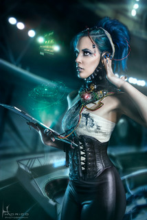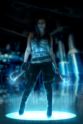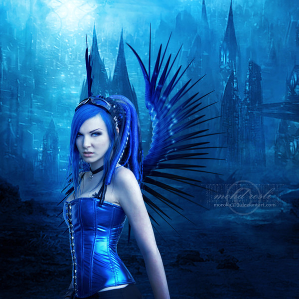 First off there is a lot of blue colour wise and it really stands out with the futuristic shapes, The Actual background i think is amazing with all the electricity and industrial/Futuristic look this i find is very nice and unique and i also think that the Beautiful cybergothic/Futuristic lady looks very good she really stands out. at first glance you notice the lady although with all of her colours they really work with the background and i Think personally that the whole image works as one and is well and truely a masterpiece.