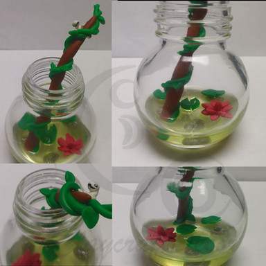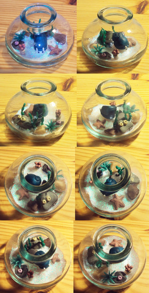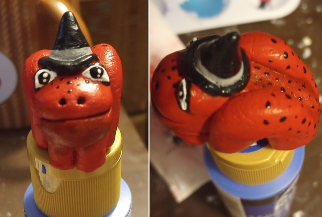 The bigged one has one upper tooth and the smaller one had a big bottom tooth. I made three teeth, but the mouths were too small to use all of them so I made a smaller spirit and gave it one. I still have one extra random, baked tooth for use later. So the extra material cycle will never end. The reeds and lilly pads were also baked in advance to be glued on top of the puddle. So this one took two bakes for parts. Actually only the teeth were baked twice, lilly pads and reeds were glued after the main bake.