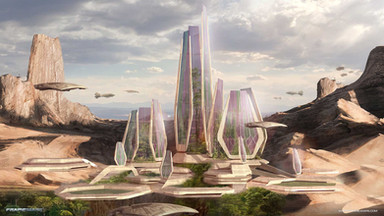 Great scene. I really love seeing futuristic cities built in harmony with the surrounding verdant green environment.
