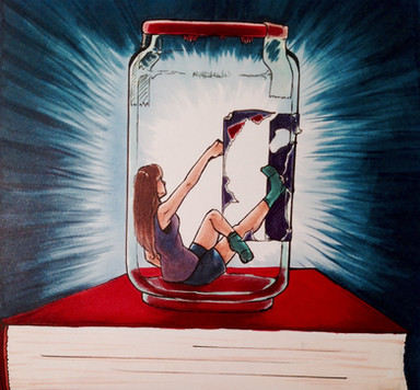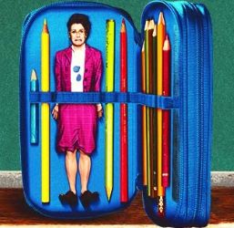 One of my first experimentations in watercolor pencils, which I now love. Ria frequently takes her shrunken friend to the library, which raises more than a few eyebrows...Related content