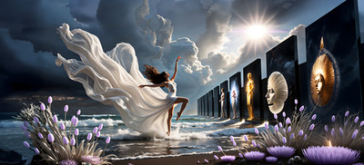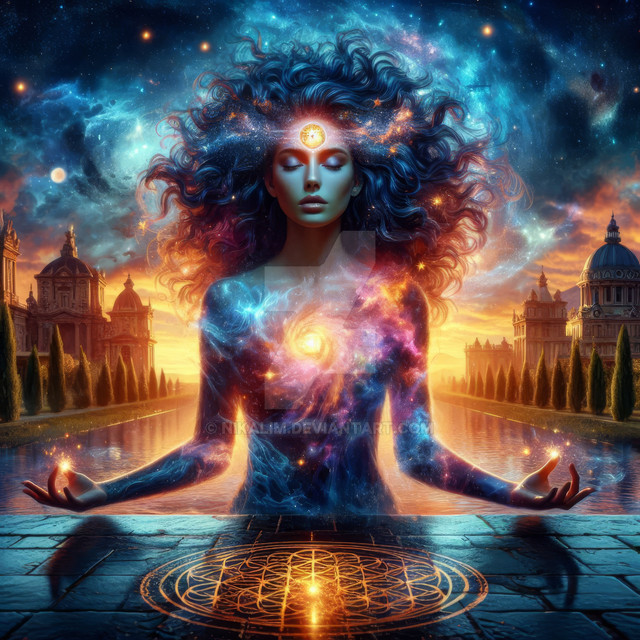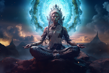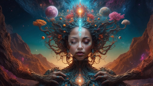 Embark on an odyssey through an ethereal dimension where spirituality intertwines with surreal landscapes and transcendental energies. Within this surreal tapestry, amidst swirling mists and vibrant hues of colorful smoke, an enigmatic character traverses the cosmic expanse, guided by the spirits dwelling within sacred rituals and divine places.This vibrant panorama springs from a full DMT-inspired imagination, painting a canvas that reflects the echoes of a Psy Art world. Enigmatic melodies of Psy Trance harmonize with the intricate patterns of Sacred Geometry, adorning the very fabric of this mesmerizing reality.