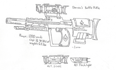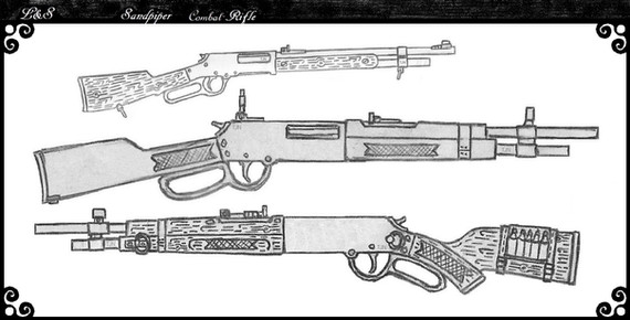 This is the Carson Range Rifle, it is designed to maximize range at the exspence of ALL else! The barrel is 8 feet long and fires .69+ rounds of amunition. The weapon uses a Lever Action system similar to a Winchester and also like the Blackfish Carbine. The major difference is it uses a cylender like a revolver.To load the weapon you slide the scope forward, opening the breach. Each cylender has 4 chambers and is inserted into the breach. Once the cylinder is aligned properly a pin locks the cylinder in place. the scope is the pulled back over to cover the cylinder.