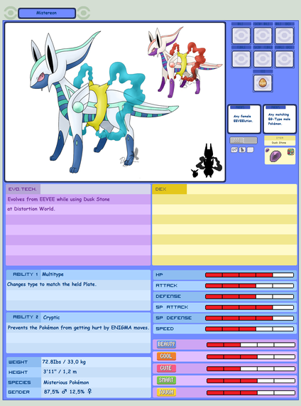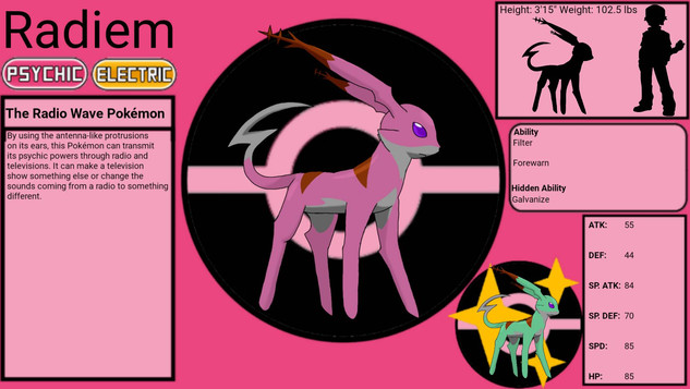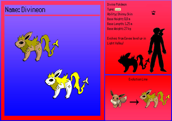 My Light-type Eeveelution Raeon!It was my one and only fave of my fan types (cuz there really was only one) but as soon as I finished Rhythmeon Raeon took second in the "Fan Four". It was also going to be called Soleon for the spanish word for sun but then relized it sounded exactlly like Souleon, my ghost type, its name was then changed to Raeon. Rah being the egyptian god of the sun.