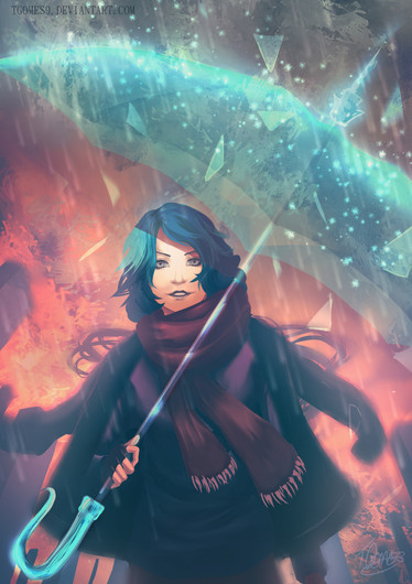 Even with your caption, there's so much emotion behind this piece that seems to cry out for release. Between SBJ 09's black coat, her downturned gaze, her tears, and her robotic companion holding an ineffectual umbrella, it could be interpreted as so many things: a funeral, a solemn ceremony, a parade or a memorial service. And that's not even taking into account her glowing hair accessory which could have a story of its own behind it.Β