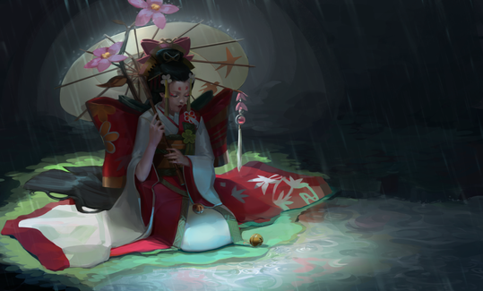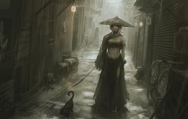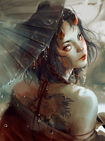 Gorgeous! The colours are exquisite, I love the illumination in her earrings and what's behind her and I can almost feel and hear the rain falling around her. Lovely work!