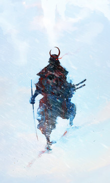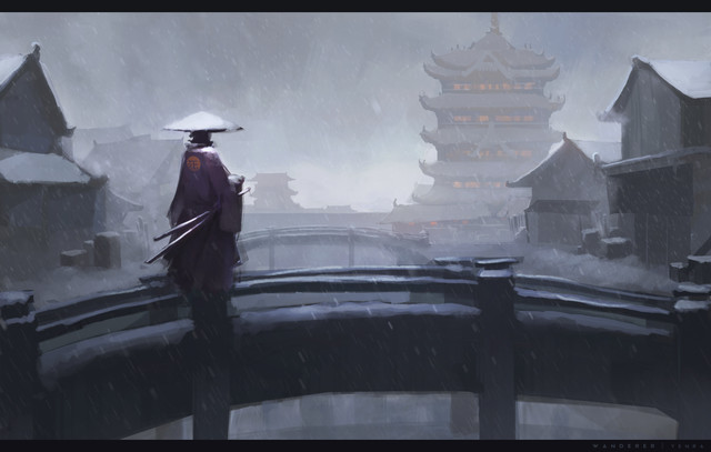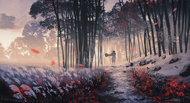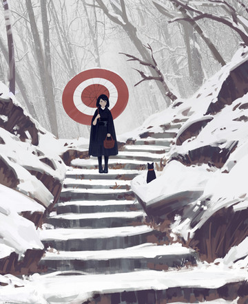 I love the composition especially the way the stairs and lights flow down the piece towards the person who's looking at it and how it makes you look at the girl because it's kinda blurred out the bottom stairs and only a bit of colour is shown on the umbrella thingy and the cat, making your eyes focus in that part of the painting. But even with monochrome tones in the background it looks so incredible and conveys a very real snowy mountain...