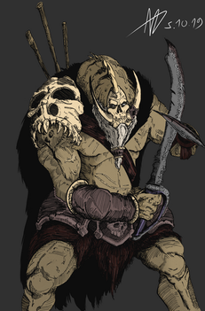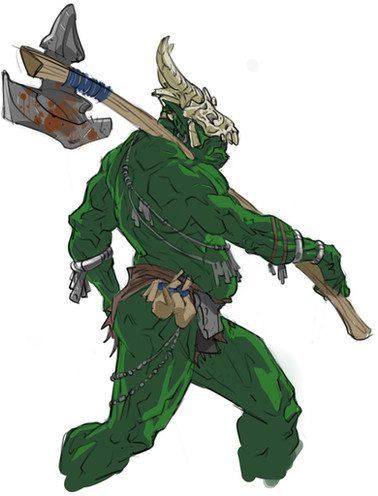 They didn't want to think about the possibility of the thing following them back to the settlement, it was too frightening, and it would mean that they had doomed all the others sleeping inside those walls. And that's exactly what happened. Everyone woke up with the sound of a door being torn down. It was an ogre, one eye shining yellow, and the other sown shut. It's mouth contorted in a horrible smile with bent teeth. The creature was as large as a bear, and carried a gigantic axe with a skull embebbed in it, one eyehole shining just like the ogre's eye. The band of explorers had no idea, but that was the first time in a while the creature had the joy of spreading fear, and it would relish in it for the next week.
