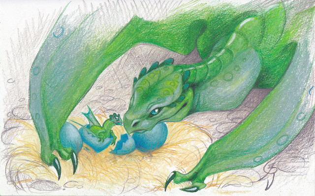 My favorite parts are the mother dragon's facial expression and the background. But really, I admire the entire piece. Way to go!